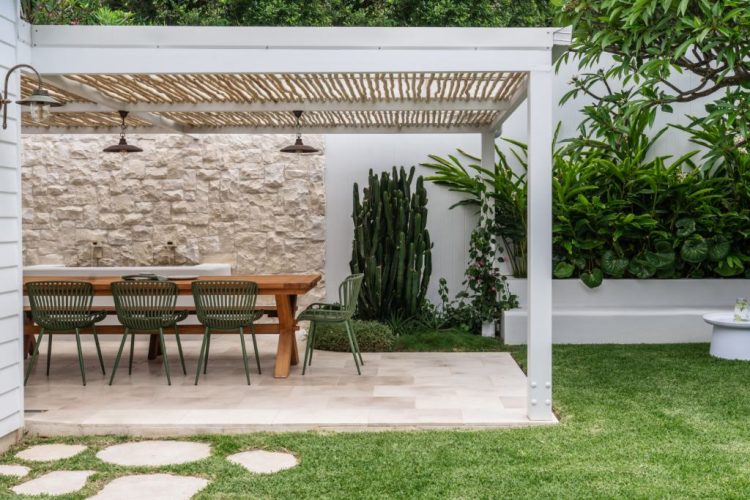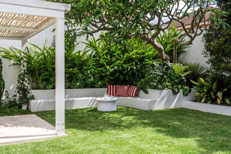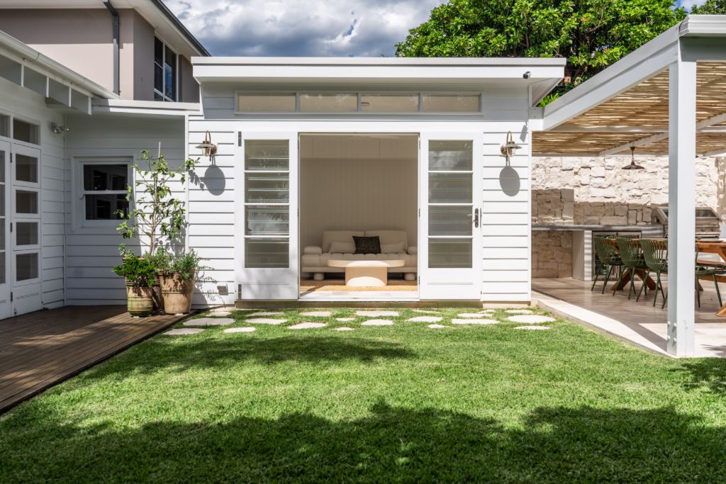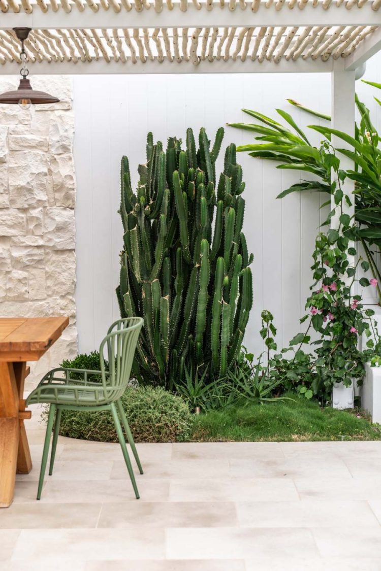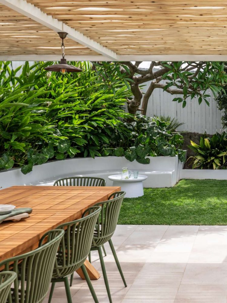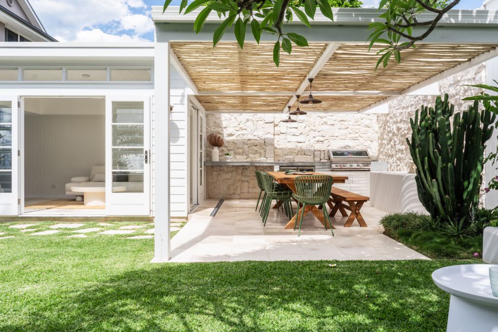 A contemporary coastal garden with Mediterranean cues, defined by bold tropical planting, crisp whites and natural materials. The renovated studio, pergola, outdoor kitchen, water feature and curved firepit seating create a cohesive landscape for relaxed and effortless hosting.