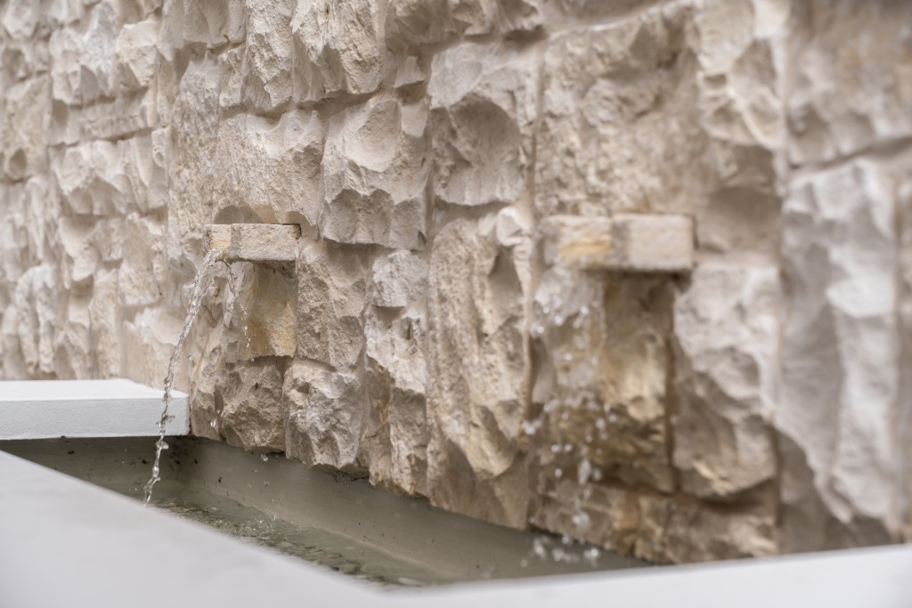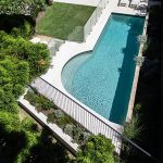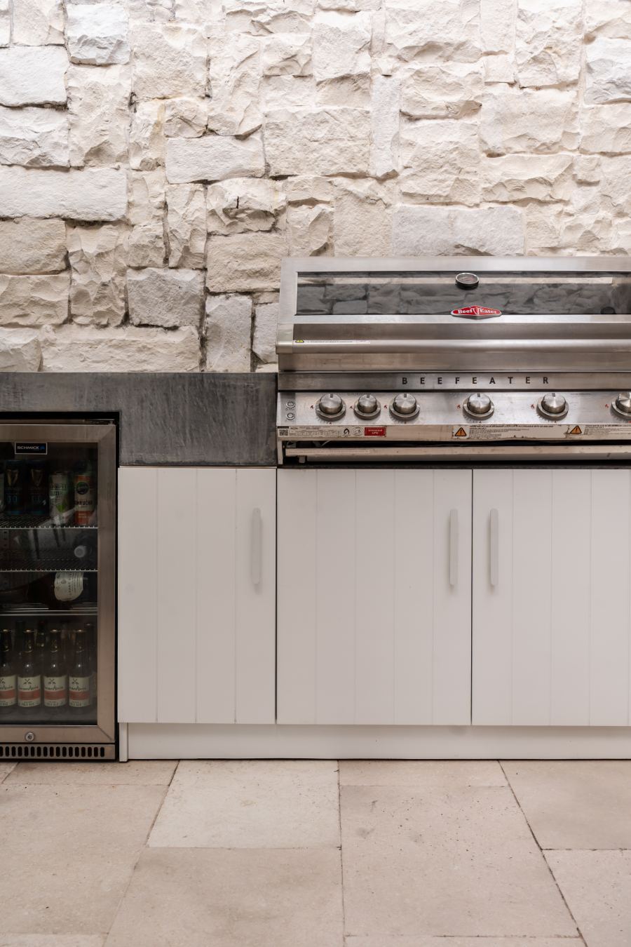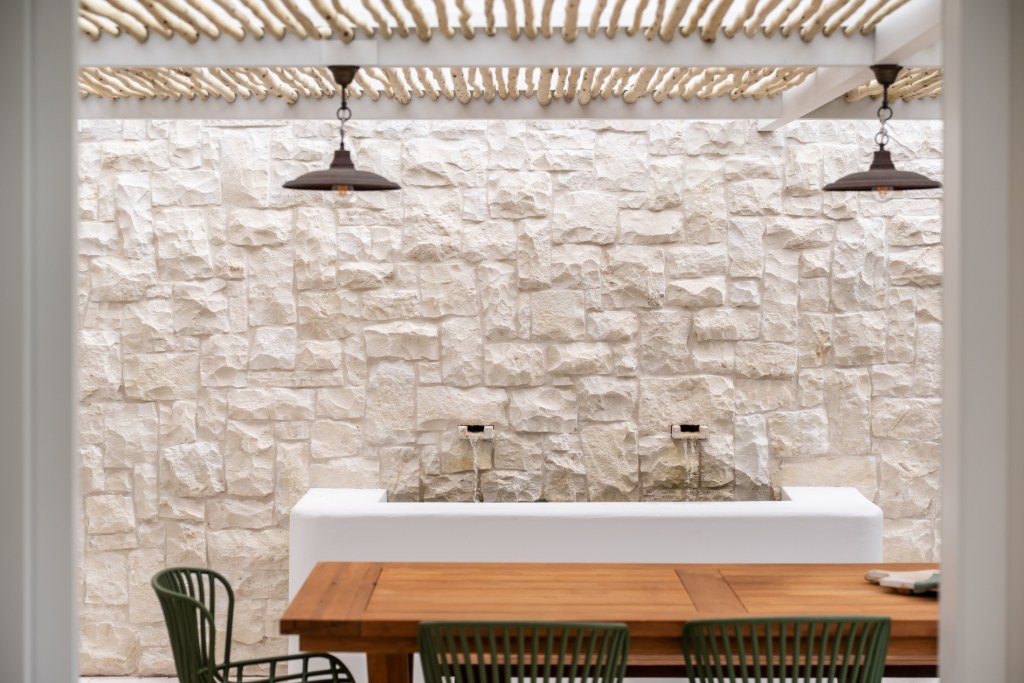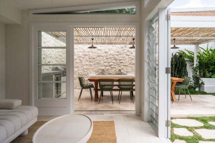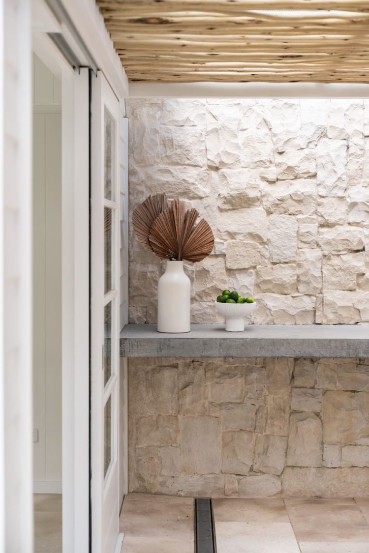 A contemporary coastal garden with Mediterranean cues, defined by bold tropical planting, crisp whites and natural materials. The renovated studio, pergola, outdoor kitchen, water feature and curved firepit seating create a cohesive landscape for relaxed and effortless hosting.