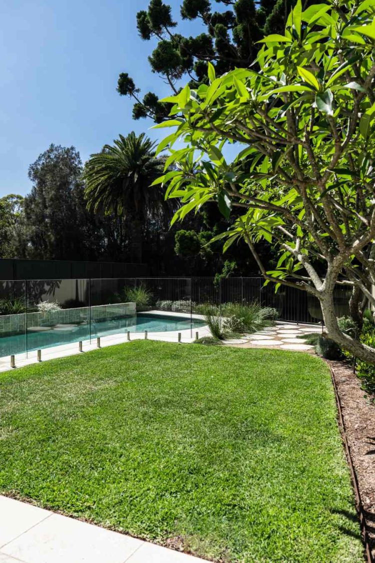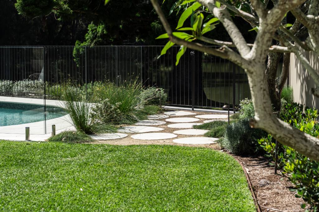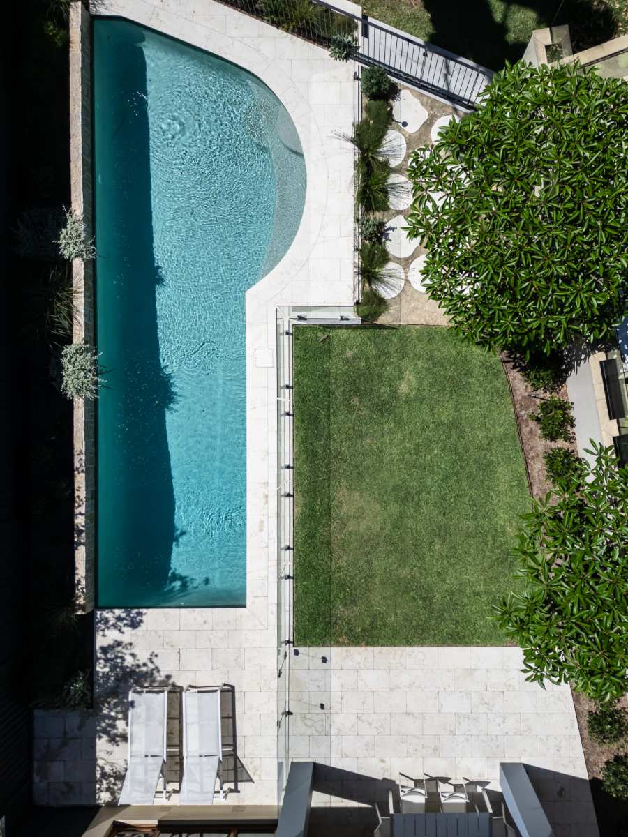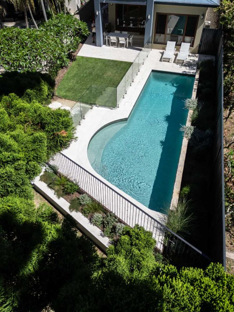 A contemporary Australian coastal garden designed to connect visually with Manly Lagoon. The renovated pool zone is modernised with new paving, mosaic tiling, pool interior and stone wall cladding. A discreet pool fence dissolves the boundary between public and private space, maximising views while retaining privacy.
