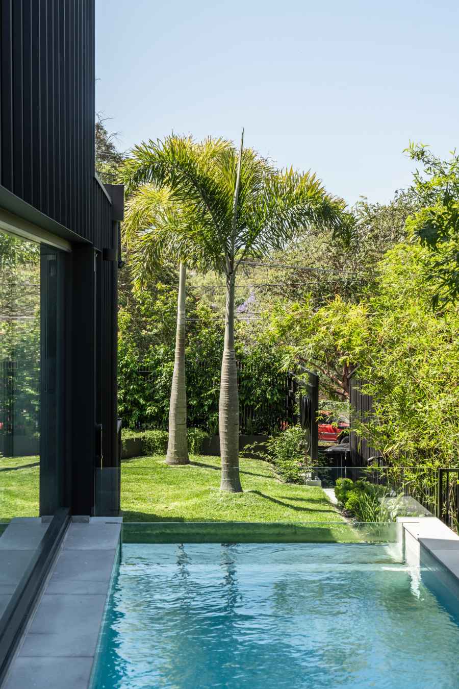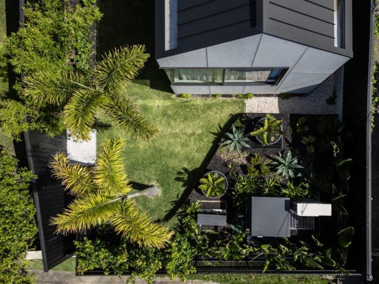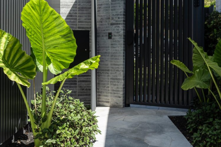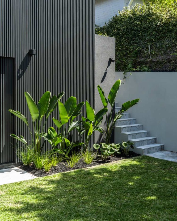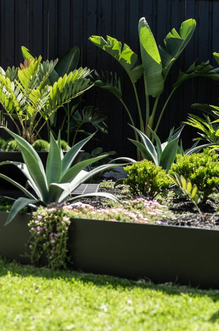 A modern tropical garden designed to complement the striking new home by Carla Middleton Architecture. Deep greens and silver species contrast against the strong black built form, with architectural planting and feature palms creating a landscape that feels well established.