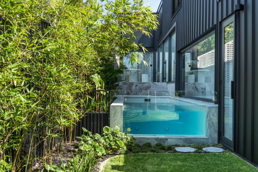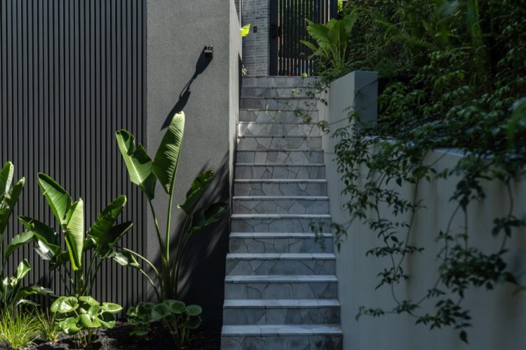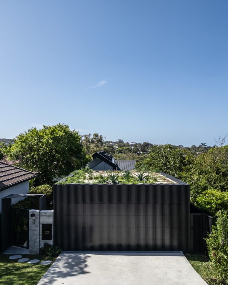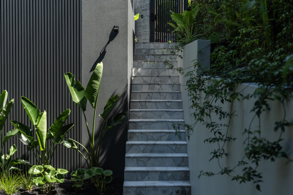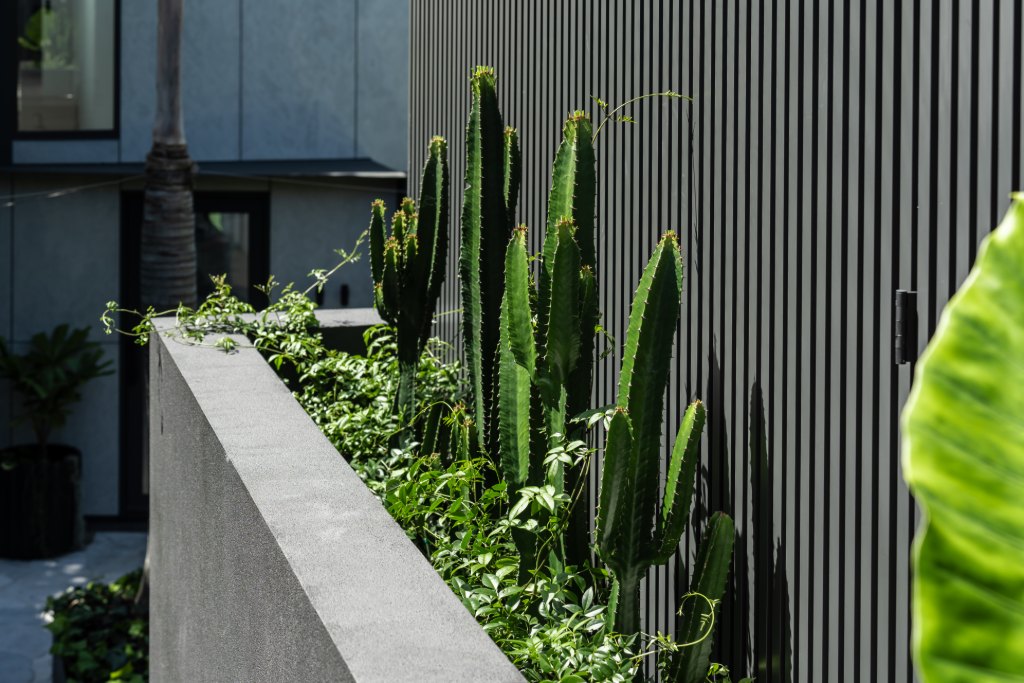 A modern tropical garden designed to complement the striking new home by Carla Middleton Architecture. Deep greens and silver species contrast against the strong black built form, with architectural planting and feature palms creating a landscape that feels well established.